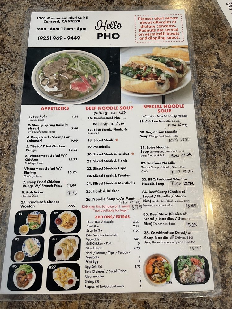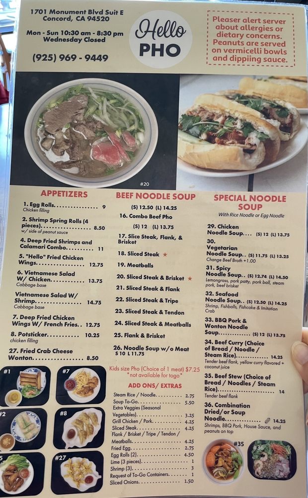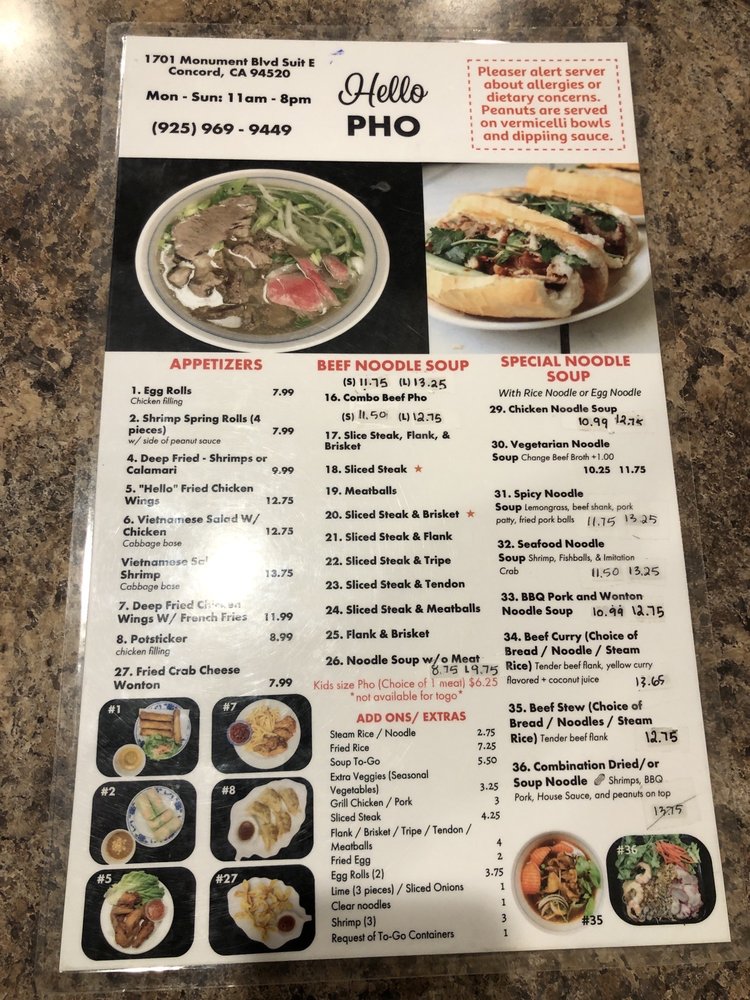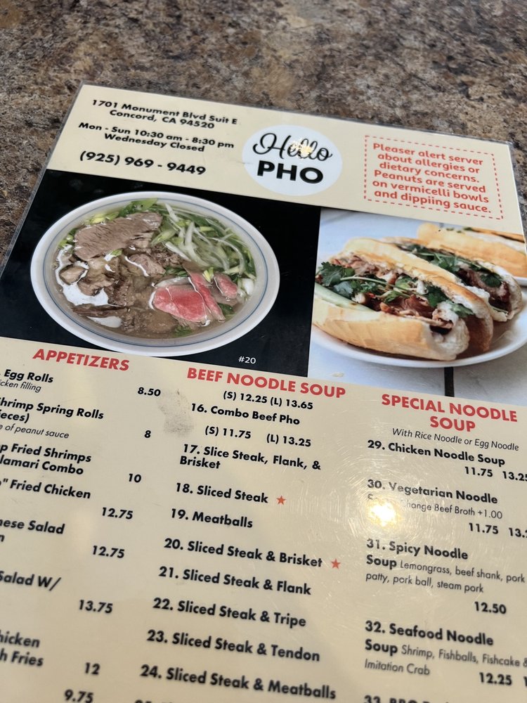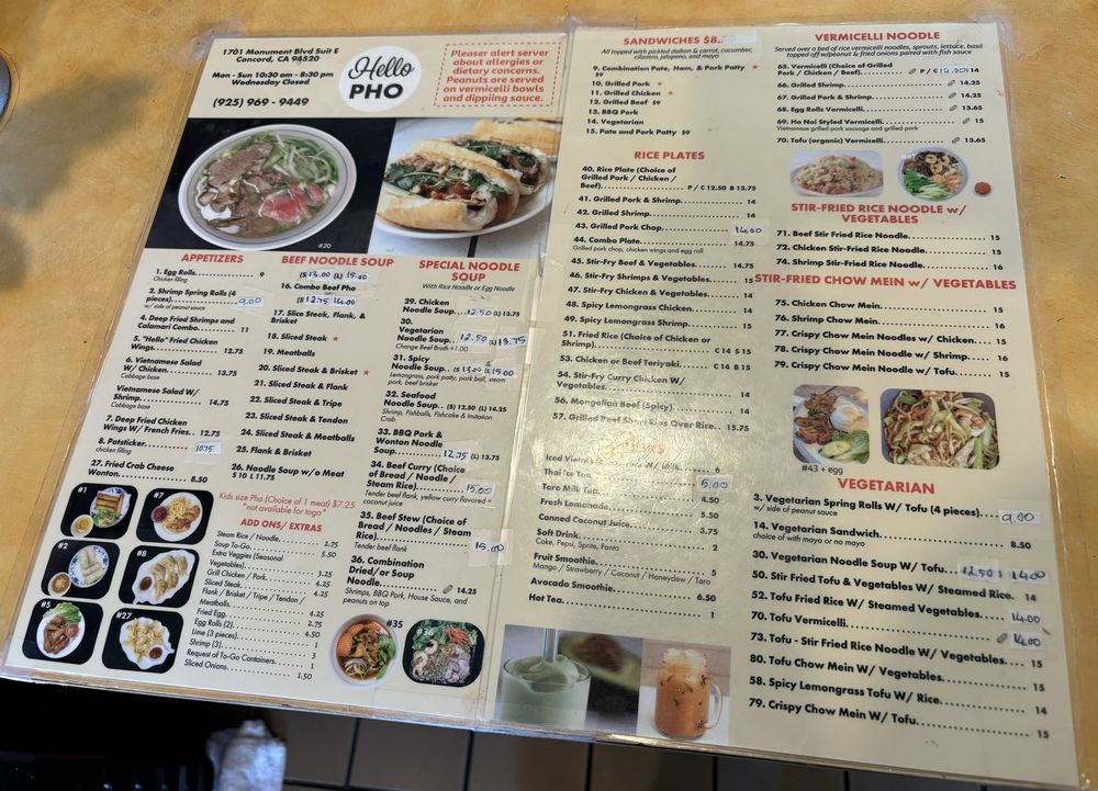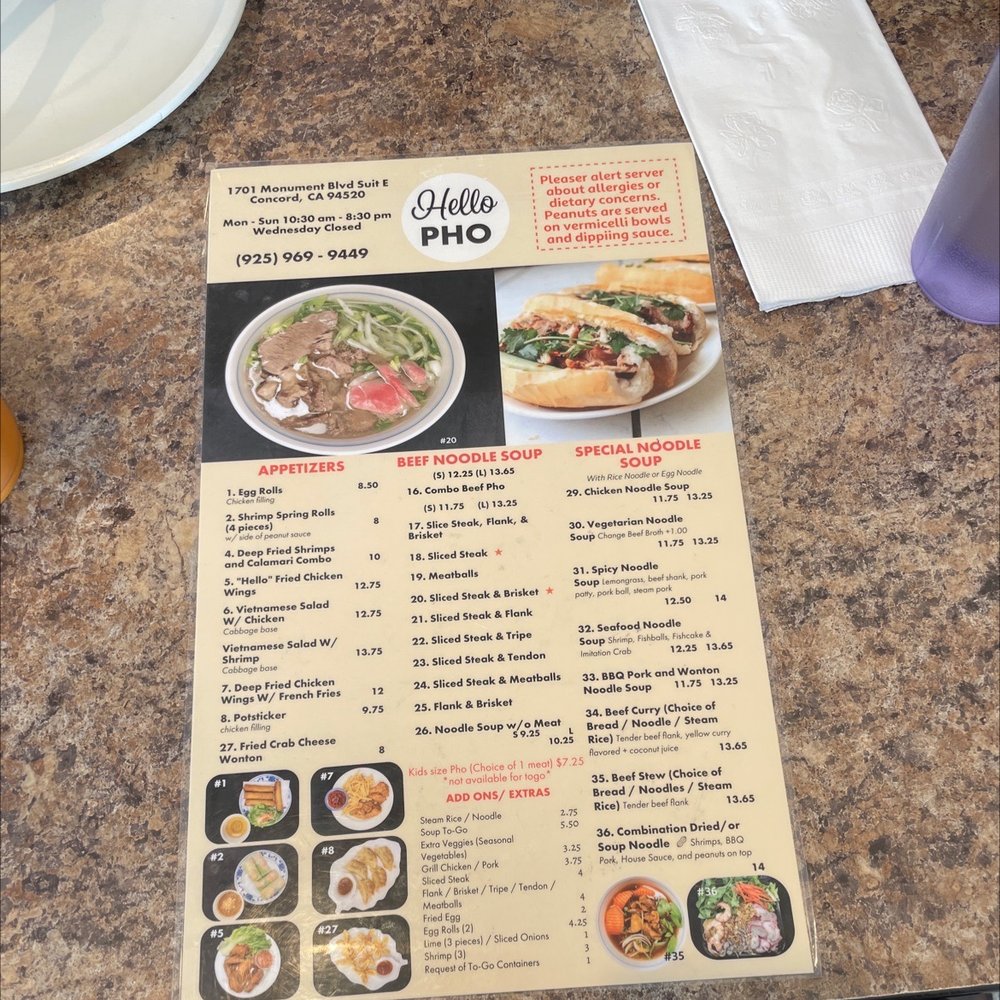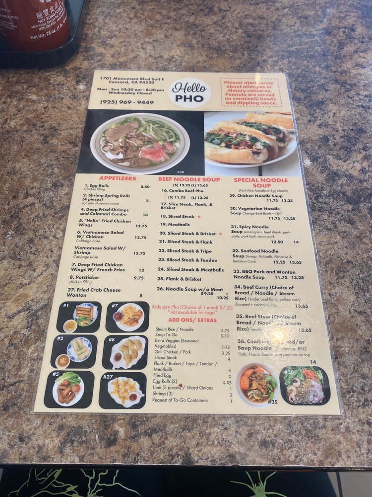 Introducing Hello Pho, a Vietnamese restaurant in Concord, CA, offering a variety of delicious soups, sandwiches, and vegan options. With a cozy atmosphere and friendly staff, Hello Pho provides a diverse menu including appetizers like spring rolls, flavorful pho dishes, vermicelli bowls, and banh mis. Customers rave about the quick service, fresh food, and ample portion sizes. Highlights include the BBQ pork banh mi, seafood pho, and tofu spring rolls. The restaurant also offers catering services, outdoor seating, and accepts various payment methods. Don't miss out on the opportunity to explore the diverse and tasty dishes at Hello Pho. Next time you're in the Concord area, be sure to stop by and enjoy a satisfying meal at this gem of a restaurant.